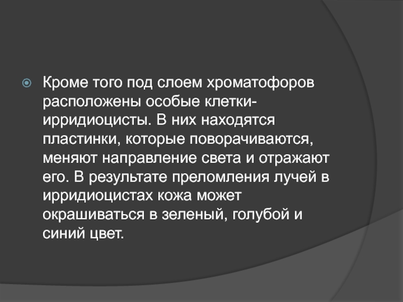 Кроме того под слоем хроматофоров расположены особые клетки-ирридиоцисты. В них находятся