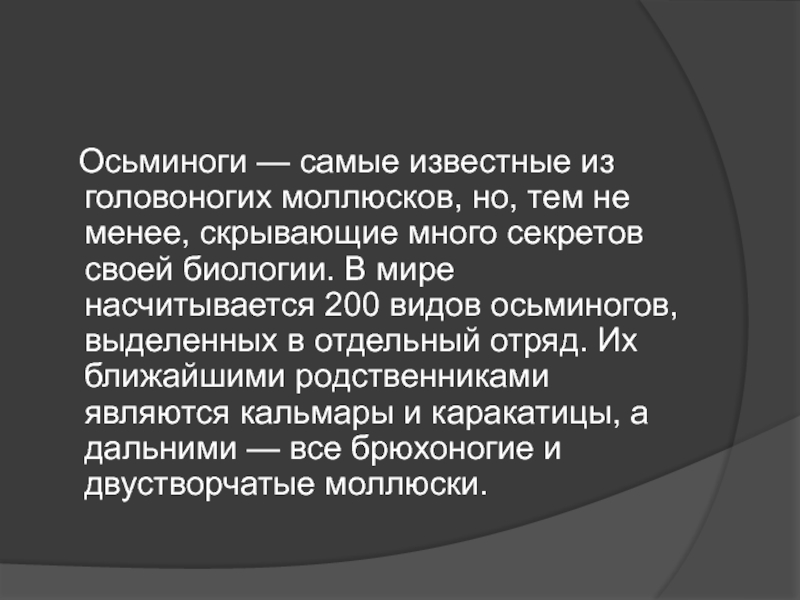 не менее, скрывающие много секретов своей биологии. В мире насчитывается 200 видов осьминогов, выделенных в отдельный отряд. Их ближайшими родственниками являются кальмары и каракатицы, а дальними — все брюхоногие и двустворчатые моллюски.