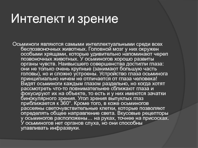 мозг у них окружен особыми хрящами, которые удивительно напоминают череп позвоночных животных. У осьминогов хорошо развиты органы чувств. Наивысшего совершенства достигли глаза: они не только очень крупные (занимают большую часть головы), но и сложно устроены. Устройство глаза осьминога принципиально ничем не отличается от глаза человека! Видят осьминоги каждым глазом раздельно, но когда хотят рассмотреть что-то повнимательнее сближают глаза и фокусируют их на объекте, то есть и у них имеются зачатки бинокулярного зрения. Угол зрения выпуклых глаз приближается к 360°. Кроме того, в коже осьминогов рассеяны светочувствительные клетки, которые позволяют определять общее направление света. Вкусовые рецепторы у осьминогов расположены… на руках, точнее на присосках. У осьминогов нет органов слуха, но они способны улавливать инфразвуки.
