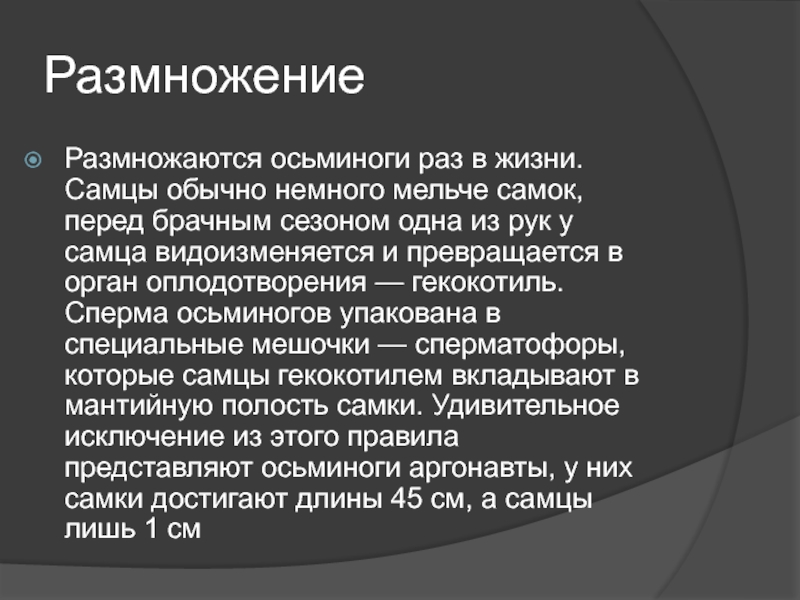 брачным сезоном одна из рук у самца видоизменяется и превращается в орган оплодотворения — гекокотиль. Сперма осьминогов упакована в специальные мешочки — сперматофоры, которые самцы гекокотилем вкладывают в мантийную полость самки. Удивительное исключение из этого правила представляют осьминоги аргонавты, у них самки достигают длины 45 см, а самцы лишь 1 см