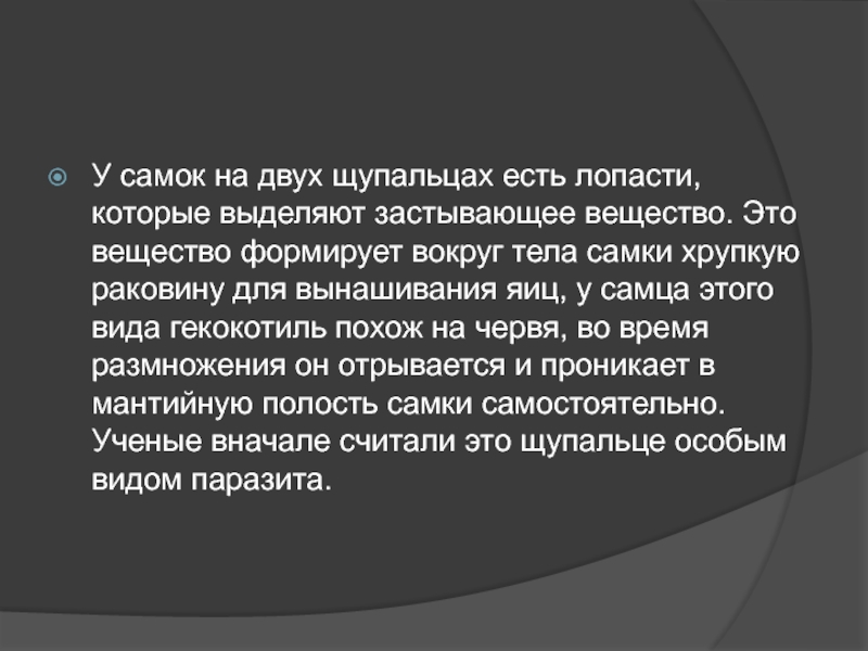 Это вещество формирует вокруг тела самки хрупкую раковину для вынашивания яиц, у самца этого вида гекокотиль похож на червя, во время размножения он отрывается и проникает в мантийную полость самки самостоятельно. Ученые вначале считали это щупальце особым видом паразита.