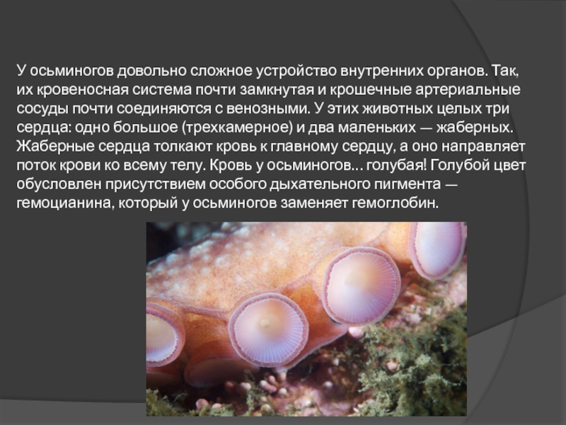 Слайд 6У осьминогов довольно сложное устройство внутренних органов. Так, их кровеносная система