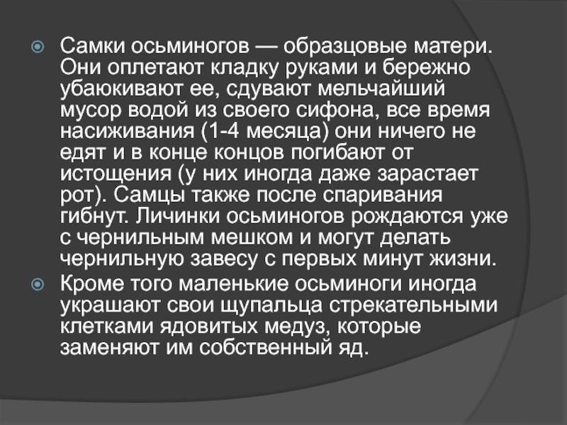 убаюкивают ее, сдувают мельчайший мусор водой из своего сифона, все время насиживания (1-4 месяца) они ничего не едят и в конце концов погибают от истощения (у них иногда даже зарастает рот). Самцы также после спаривания гибнут. Личинки осьминогов рождаются уже с чернильным мешком и могут делать чернильную завесу с первых минут жизни.