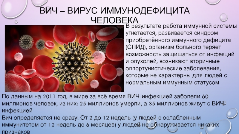 По данным на 2011 год, в мире за всё время ВИЧ-инфекцией заболели 60 миллионов человек, из них: 25 миллионов умерли, а 35 миллионов живут с ВИЧ-инфекцией
