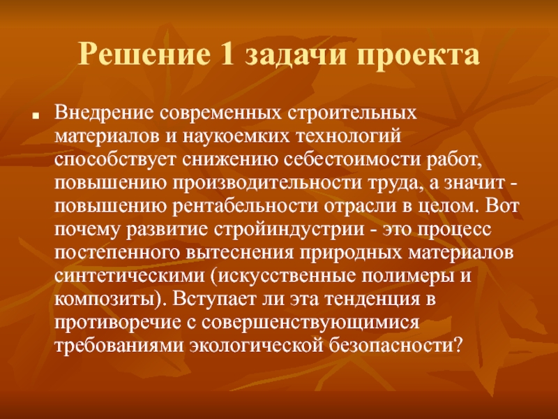 снижению себестоимости работ, повышению производительности труда, а значит - повышению рентабельности отрасли в целом. Вот почему развитие стройиндустрии - это процесс постепенного вытеснения природных материалов синтетическими (искусственные полимеры и композиты). Вступает ли эта тенденция в противоречие с совершенствующимися требованиями экологической безопасности?