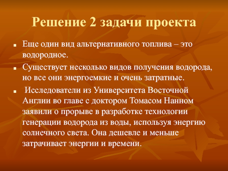 Исследователи из Университета Восточной Англии во главе с доктором Томасом Нанном заявили о прорыве в разработке технологии генерации водорода из воды, используя энергию солнечного света. Она дешевле и меньше затрачивает энергии и времени.