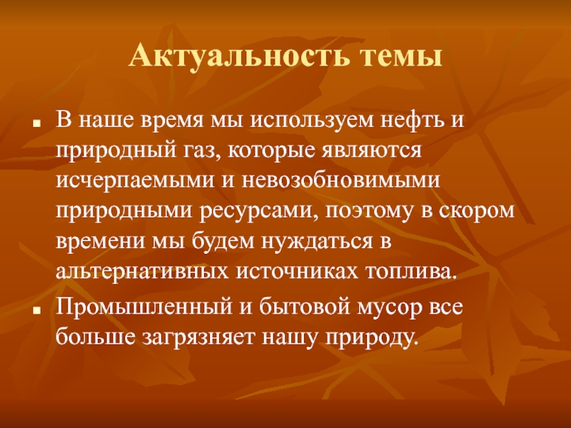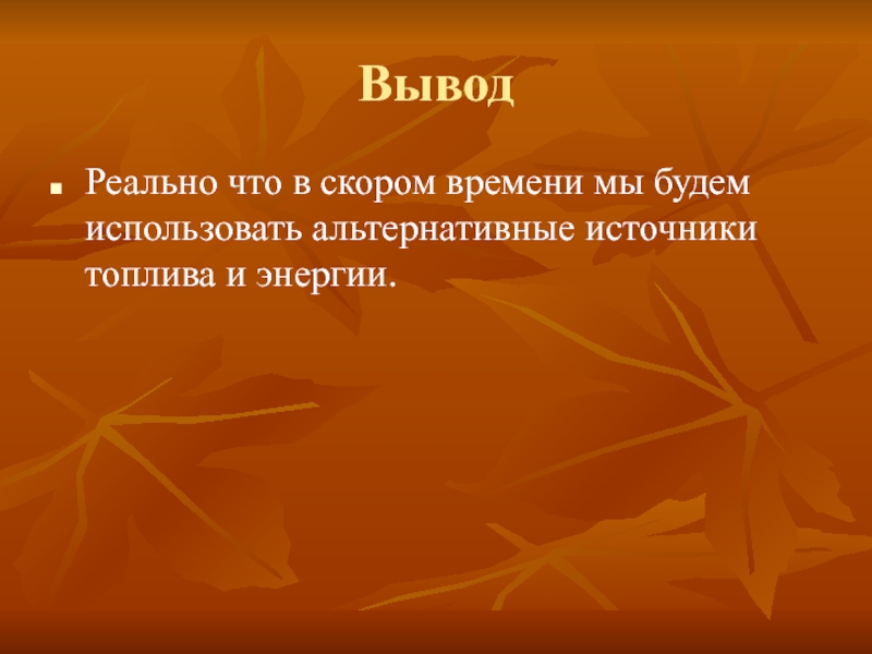 являются исчерпаемыми и невозобновимыми природными ресурсами, поэтому в скором времени мы будем нуждаться в альтернативных источниках топлива.