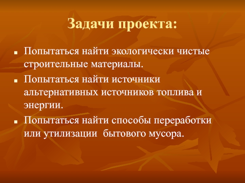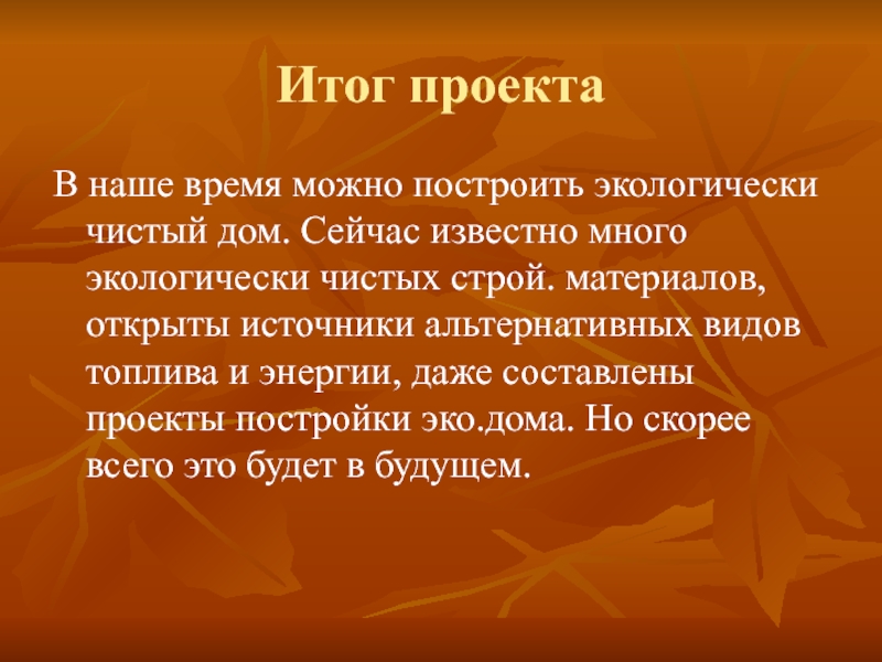 много экологически чистых строй. материалов, открыты источники альтернативных видов топлива и энергии, даже составлены проекты постройки эко.дома. Но скорее всего это будет в будущем.