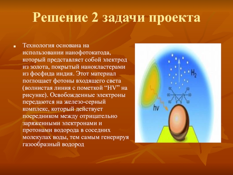 электрод из золота, покрытый нанокластерами из фосфида индия. Этот материал поглощает фотоны входящего света (волнистая линия с пометкой “HV” на рисунке). Освобожденные электроны передаются на железо-серный комплекс, который действует посредником между отрицательно заряженными электронами и протонами водорода в соседних молекулах воды, тем самым генерируя газообразный водород
