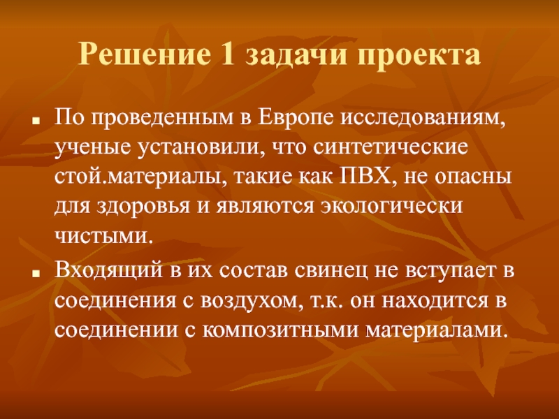 синтетические стой.материалы, такие как ПВХ, не опасны для здоровья и являются экологически чистыми.