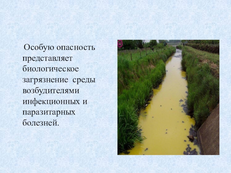 Слайд 5 Особую опасность представляет биологическое загрязнение среды возбудителями инфекционных