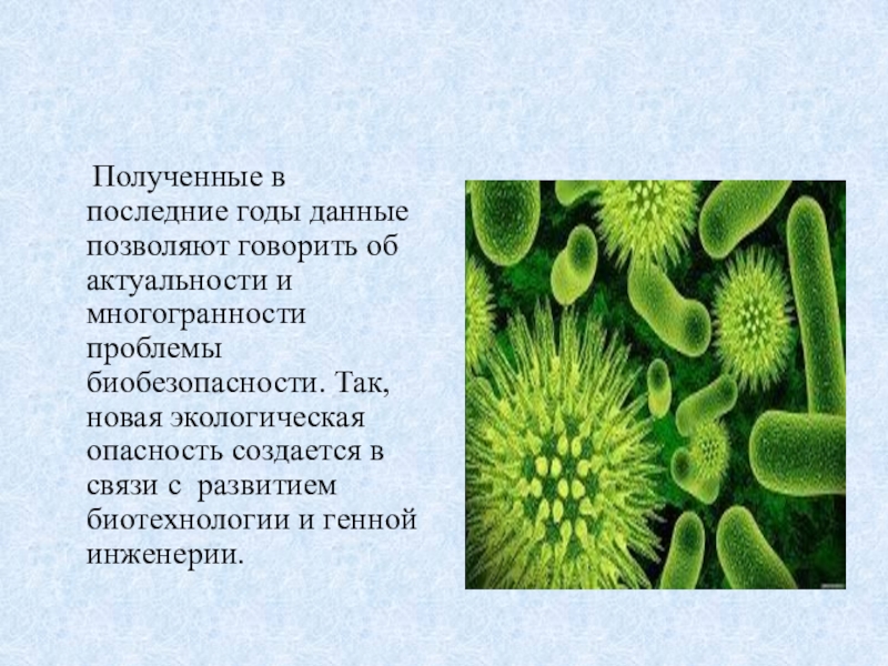 актуальности и многогранности проблемы биобезопасности. Так, новая экологическая опасность создается в связи с развитием биотехнологии и генной инженерии.