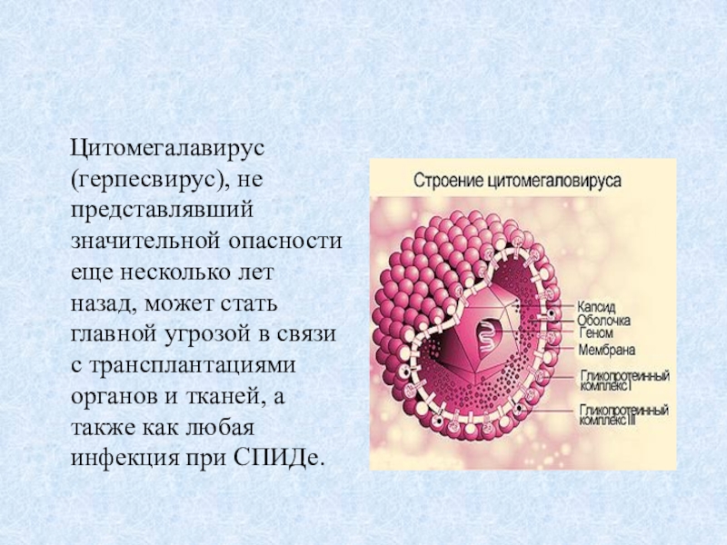 Слайд 9 Цитомегалавирус (герпесвирус), не представлявший значительной опасности еще несколько лет