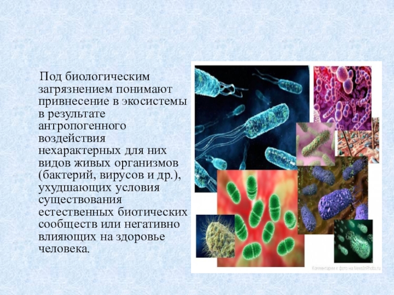 Под биологическим загрязнением понимают привнесение в экосистемы в результате антропогенного воздействия нехарактерных для них видов живых организмов (бактерий, вирусов и др.), ухудшающих условия существования естественных биотических сообществ или негативно влияющих на здоровье человека.