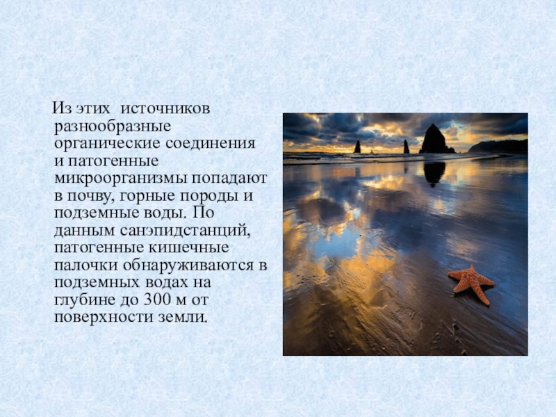 Из этих источников разнообразные органические соединения и патогенные микроорганизмы попадают в почву, горные породы и