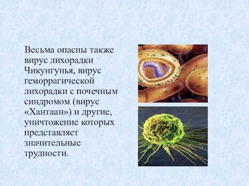 Слайд 8 Весьма опасны также вирус лихорадки Чикунгунья, вирус геморрагической лихорадки