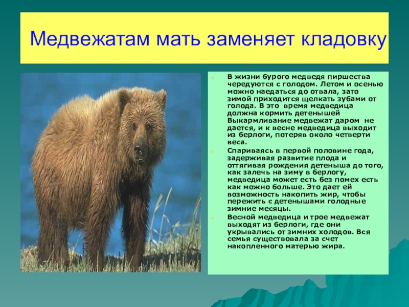 Летом и осенью можно наедаться до отвала, зато зимой приходится щелкать зубами от голода. В это время медведица должна кормить детенышей Выкармливание медвежат даром не дается, и к весне медведица выходит из берлоги, потеряв около четверти веса.