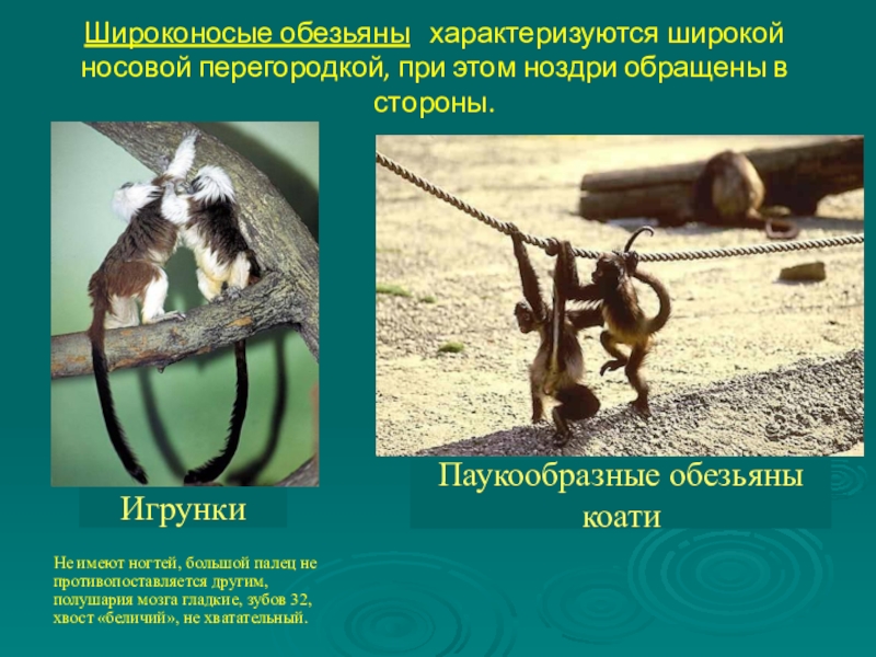Широконосые обезьяны характеризуются широкой носовой перегородкой, при этом ноздри обращены в стороны.
