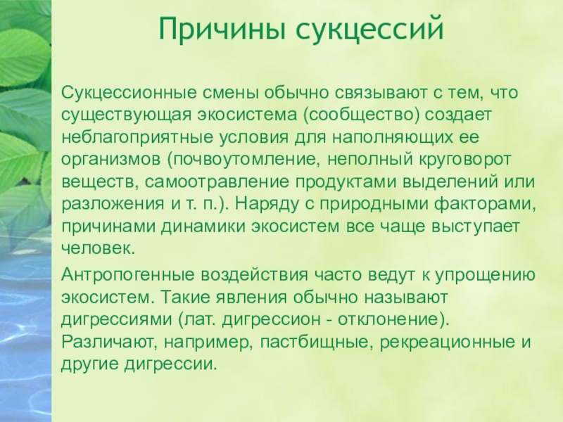 создает неблагоприятные условия для наполняющих ее организмов (почвоутомление, неполный круговорот веществ, самоотравление продуктами выделений или разложения и т. п.). Наряду с природными факторами, причинами динамики экосистем все чаще выступает человек.