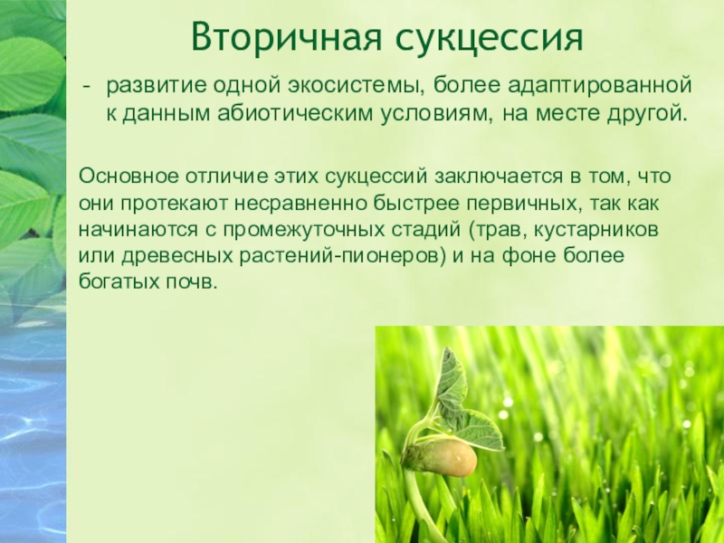 Вторичная сукцессияразвитие одной экосистемы, более адаптированной к данным абиотическим условиям, на месте другой.Основное отличие этих сукцессий заключается