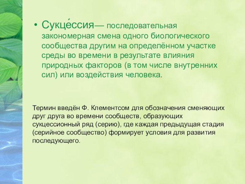 Сукце́ссия— последовательная закономерная смена одного биологического сообщества другим на определённом участке среды во времени в результате влияния природных факторов (в том числе внутренних сил) или воздействия человека. Термин введён Ф. Клементсом для обозначения сменяющих друг