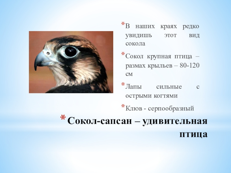 Сокол-сапсан – удивительная птицаВ наших краях редко увидишь этот вид соколаСокол крупная птица – размах крыльев – 80-120 смЛапы сильные с острыми когтямиКлюв - серпообразный