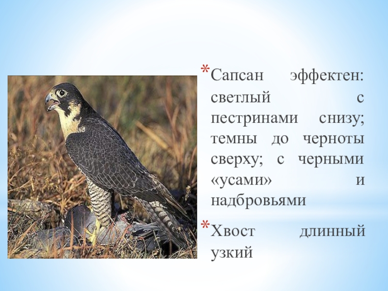 Слайд 3Сапсан эффектен: светлый с пестринами снизу; темны до черноты сверху; с