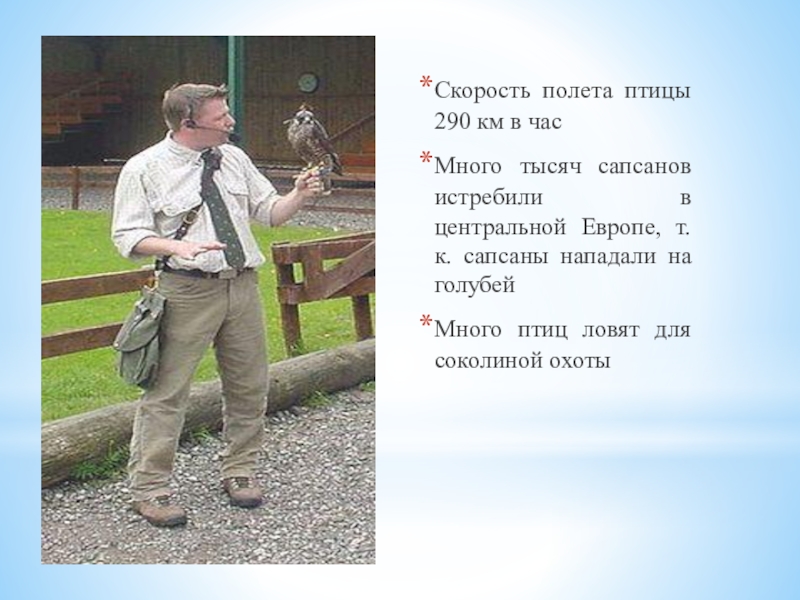Скорость полета птицы 290 км в часМного тысяч сапсанов истребили в центральной Европе, т.к. сапсаны нападали на