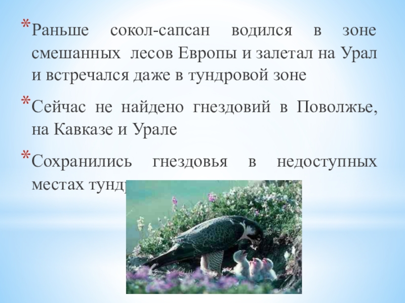 Слайд 6Раньше сокол-сапсан водился в зоне смешанных лесов Европы и залетал на
