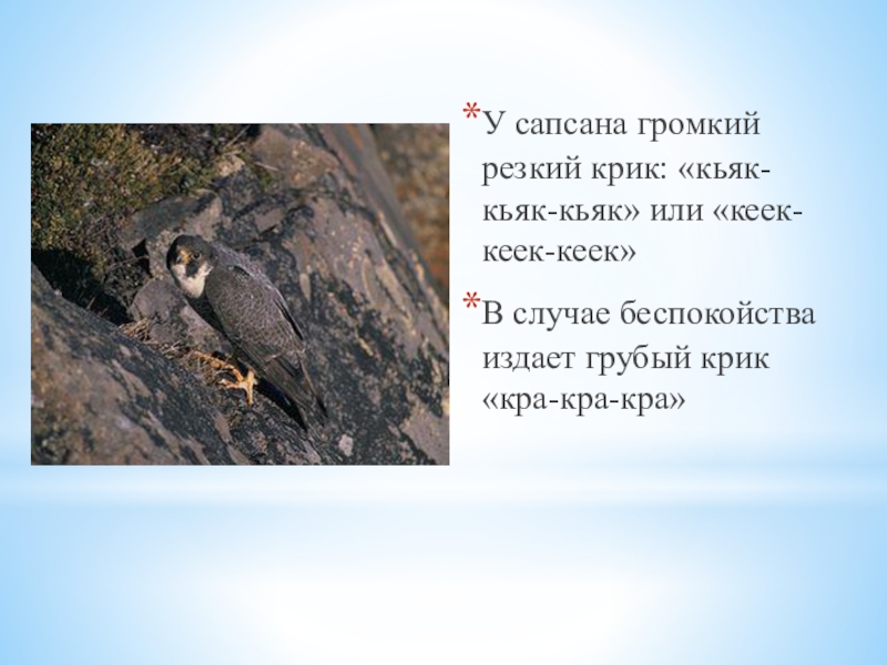 Слайд 4У сапсана громкий резкий крик: «кьяк-кьяк-кьяк» или «кеек-кеек-кеек»