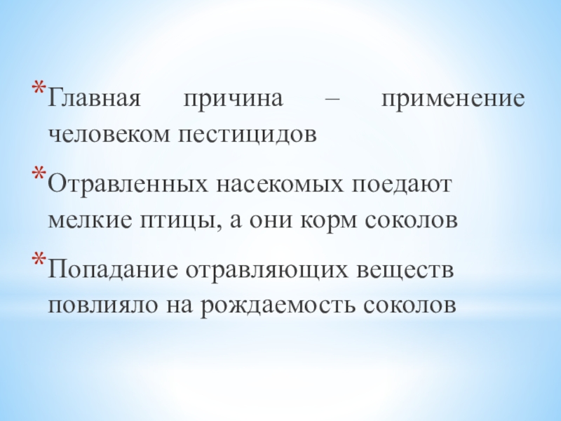 Главная причина – применение человеком пестицидовОтравленных насекомых поедают мелкие птицы, а они корм соколовПопадание отравляющих веществ повлияло