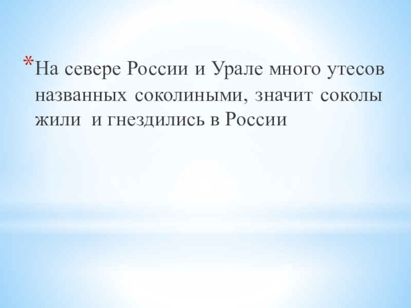 Слайд 10На севере России и Урале много утесов названных соколиными, значит соколы