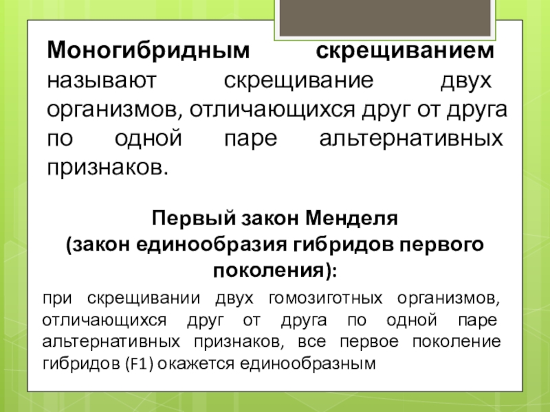 при скрещивании двух гомозиготных организмов, отличающихся друг от друга по одной паре альтернативных признаков, все первое поколение гибридов (F1) окажется единообразным