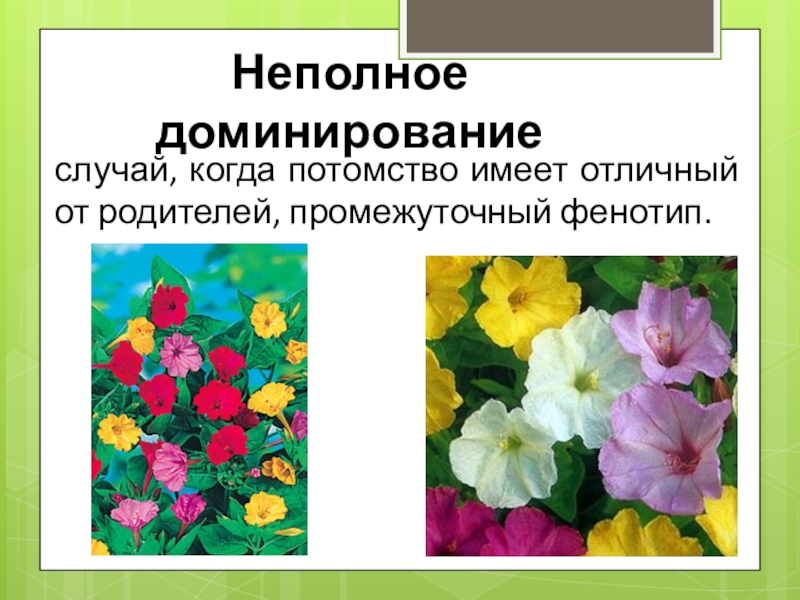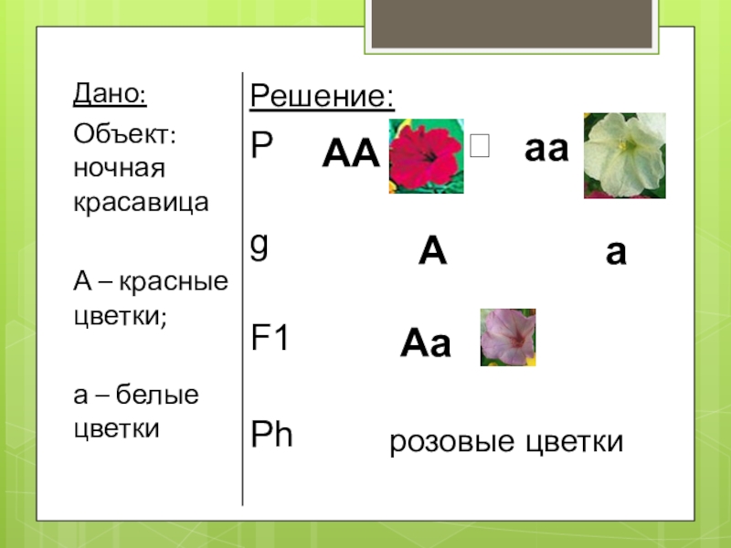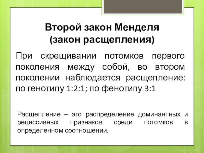 При скрещивании потомков первого поколения между собой, во втором поколении наблюдается расщепление: по генотипу 1:2:1; по фенотипу 3:1