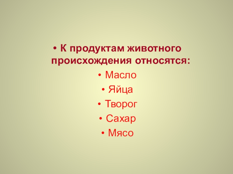 К продуктам животного происхождения относятся:МаслоЯйцаТворогСахарМясо