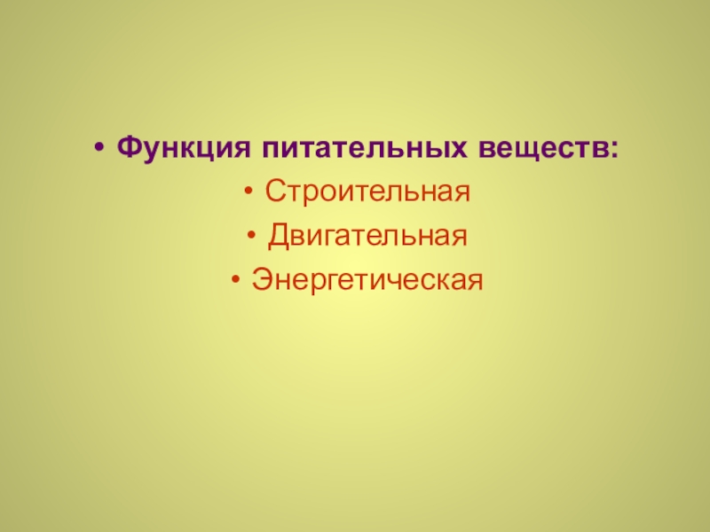 Функция питательных веществ:СтроительнаяДвигательнаяЭнергетическая
