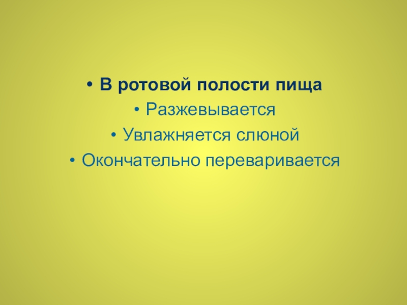 В ротовой полости пищаРазжевываетсяУвлажняется слюнойОкончательно переваривается