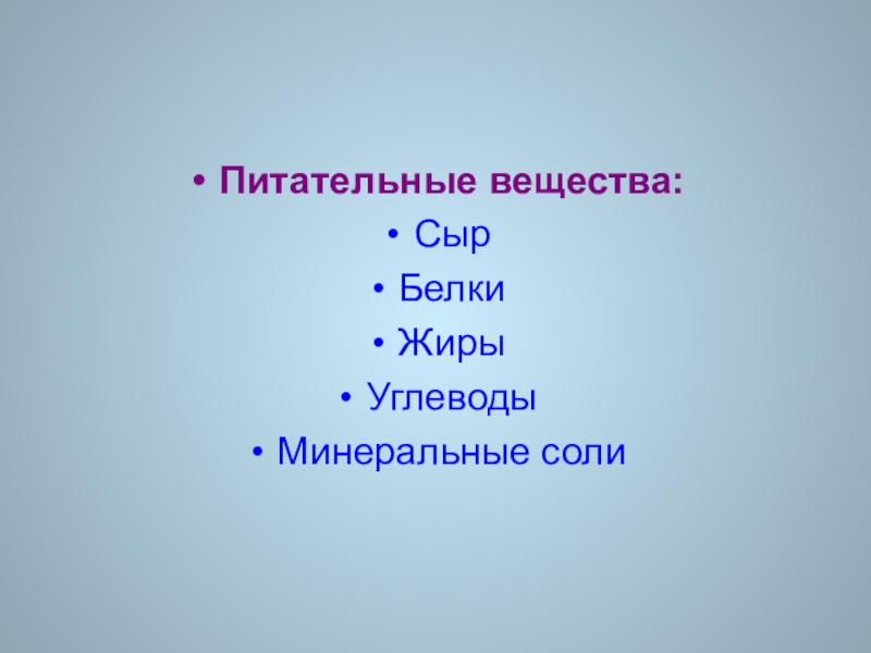 Питательные вещества:СырБелкиЖирыУглеводыМинеральные соли