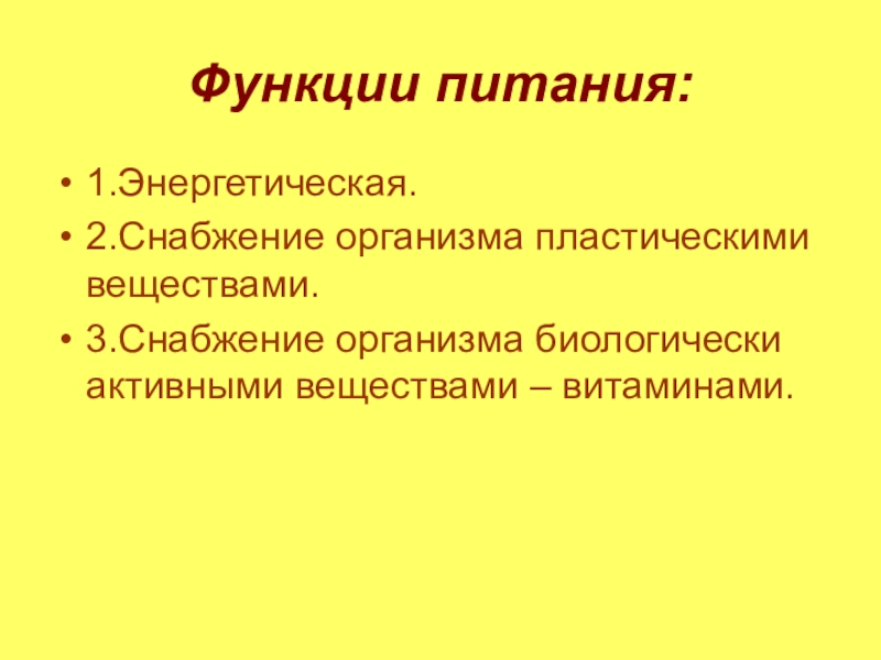 Функции питания:1.Энергетическая.2.Снабжение организма пластическими веществами.3.Снабжение организма биологически активными веществами – витаминами.