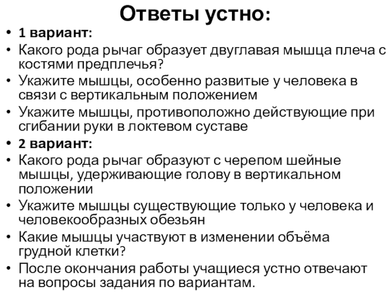 После окончания работы учащиеся устно отвечают на вопросы задания по вариантам.