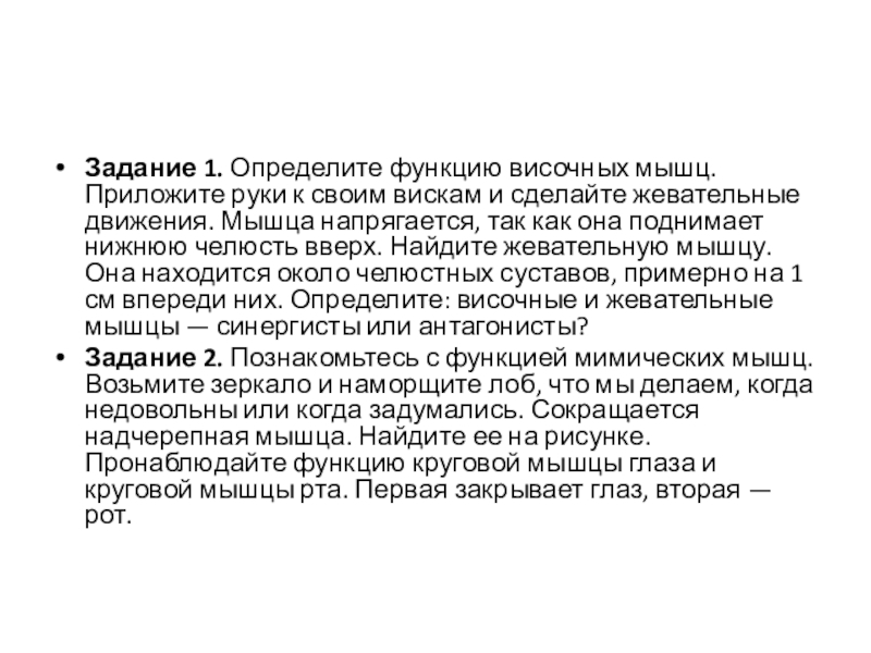 Слайд 6Задание 1. Определите функцию височных мышц. Приложите руки к своим вискам и