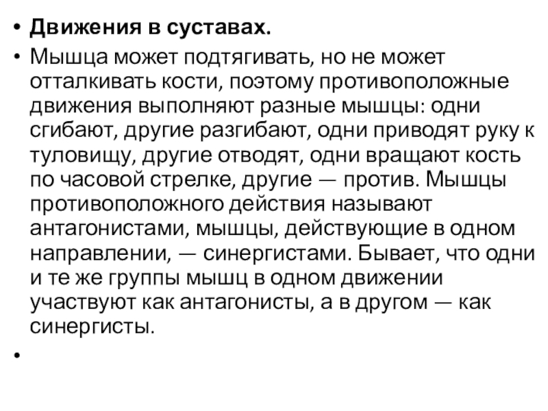 противоположные движения выполняют разные мышцы: одни сгибают, другие разгибают, одни приводят руку к туловищу, другие отводят, одни вращают кость по часовой стрелке, другие — против. Мышцы противоположного действия называют антагонистами, мышцы, действующие в одном направлении, — синергистами. Бывает, что одни и те же группы мышц в одном движении участвуют как антагонисты, а в другом — как синергисты.