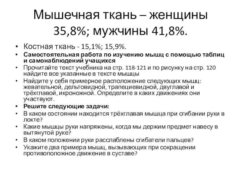 Слайд 14Мышечная ткань – женщины 35,8%; мужчины 41,8%.