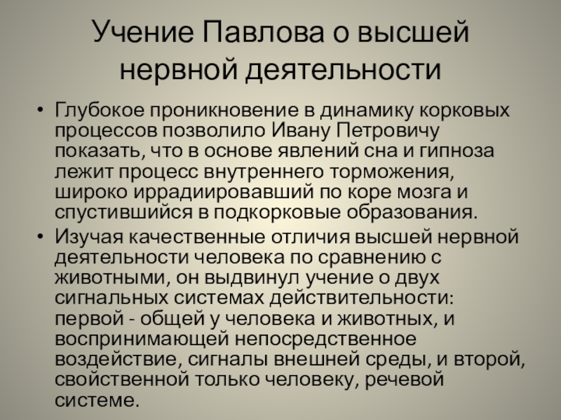 Изучая качественные отличия высшей нервной деятельности человека по сравнению с животными, он выдвинул учение о двух сигнальных системах действительности: первой - общей у человека и животных, и воспринимающей непосредственное воздействие, сигналы внешней среды, и второй, свойственной только человеку, речевой системе.