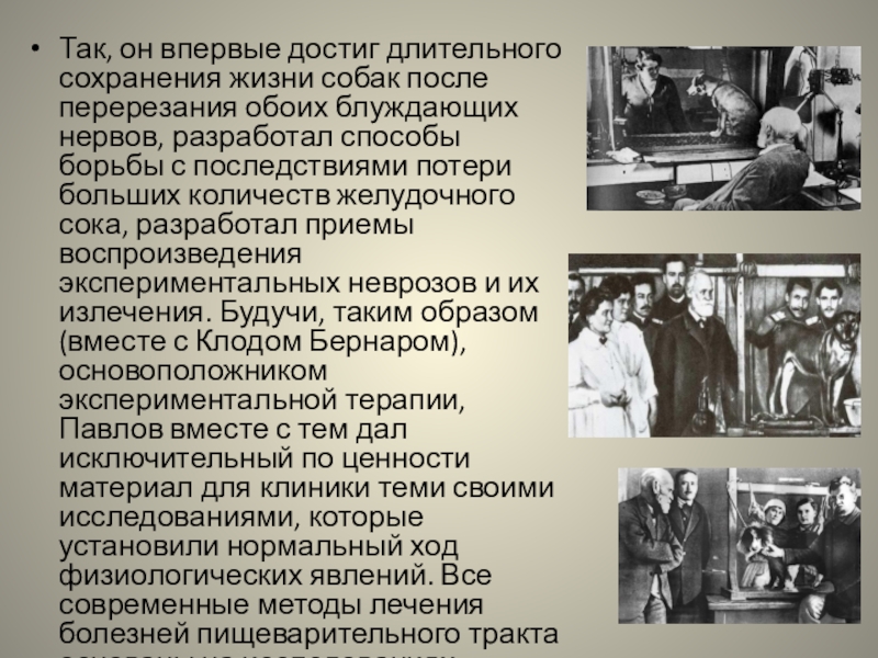 блуждающих нервов, разработал способы борьбы с последствиями потери больших количеств желудочного сока, разработал приемы воспроизведения экспериментальных неврозов и их излечения. Будучи, таким образом (вместе с Клодом Бернаром), основоположником экспериментальной терапии, Павлов вместе с тем дал исключительный по ценности материал для клиники теми своими исследованиями, которые установили нормальный ход физиологических явлений. Все современные методы лечения болезней пищеварительного тракта основаны на исследованиях Павлова.