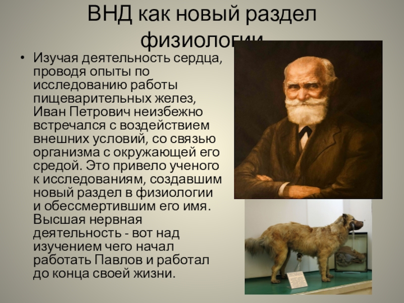 исследованию работы пищеварительных желез, Иван Петрович неизбежно встречался с воздействием внешних условий, со связью организма с окружающей его средой. Это привело ученого к исследованиям, создавшим новый раздел в физиологии и обессмертившим его имя. Высшая нервная деятельность - вот над изучением чего начал работать Павлов и работал до конца своей жизни.
