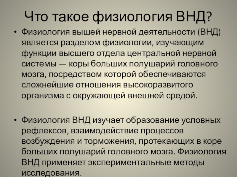 Физиология ВНД изучает образование условных рефлексов, взаимодействие процессов возбуждения и торможения, протекающих в коре больших полушарий головного мозга. Физиология ВНД применяет экспериментальные методы исследования.