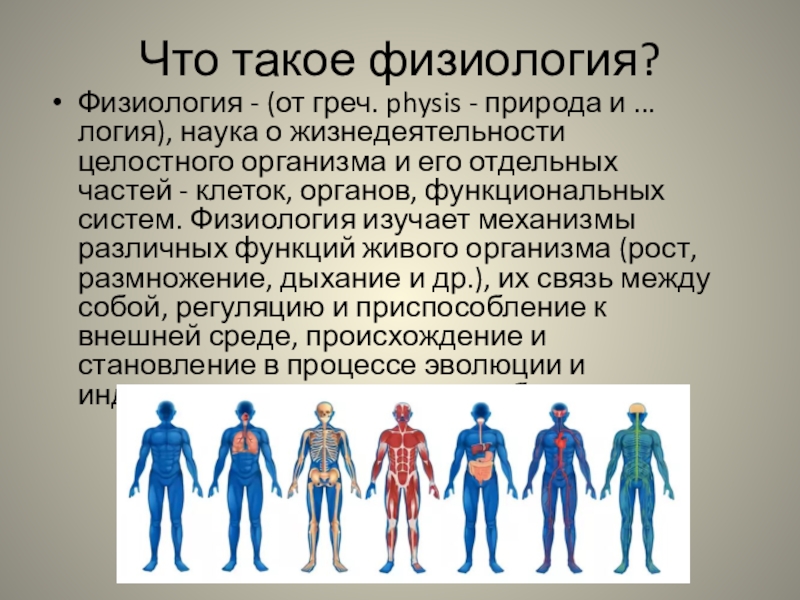 наука о жизнедеятельности целостного организма и его отдельных частей - клеток, органов, функциональных систем. Физиология изучает механизмы различных функций живого организма (рост, размножение, дыхание и др.), их связь между собой, регуляцию и приспособление к внешней среде, происхождение и становление в процессе эволюции и индивидуального развития особи.
