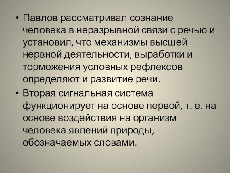 Слайд 7Павлов рассматривал сознание человека в неразрывной связи с речью и установил,