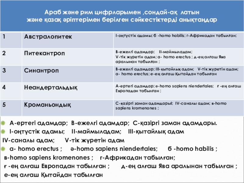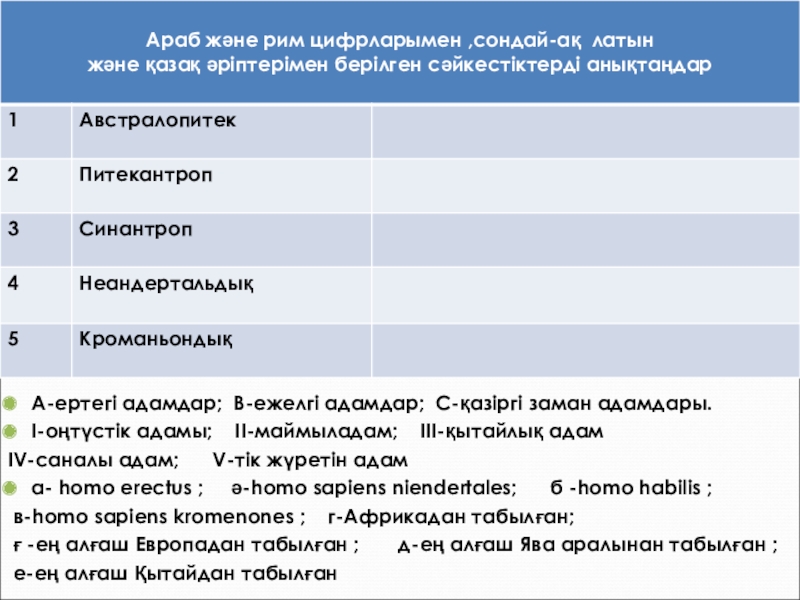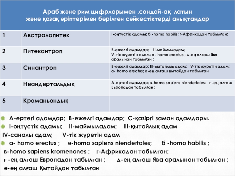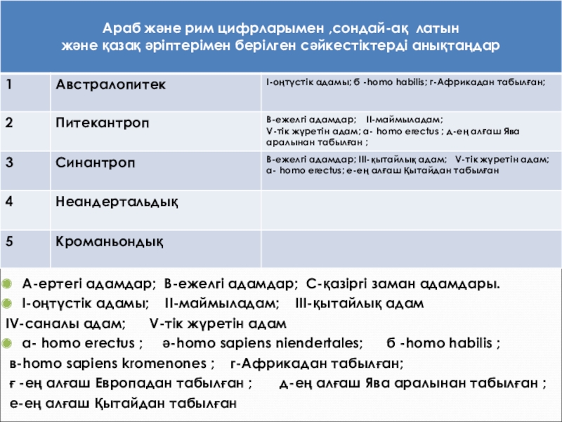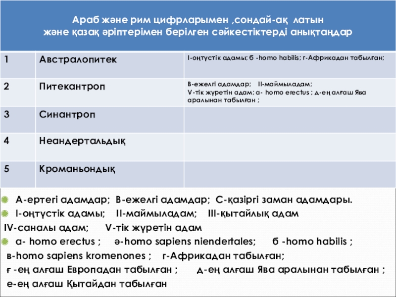 Слайд 8А-ертегі адамдар; В-ежелгі адамдар; С-қазіргі заман адамдары.